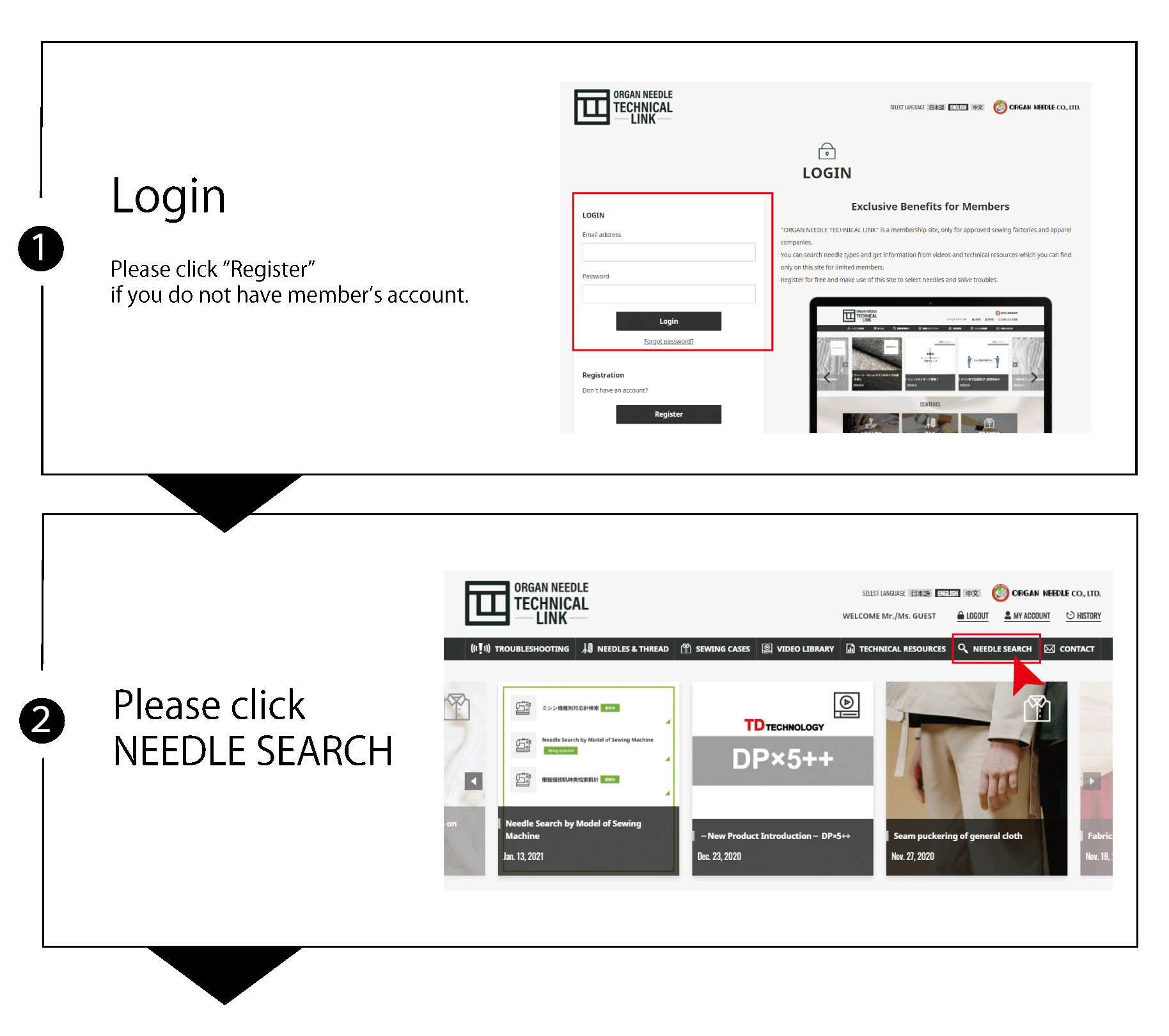 Member’s registration of ORGAN NEEDLE TECHNICAL LINK is necessary to use “Needle Search by Specification”